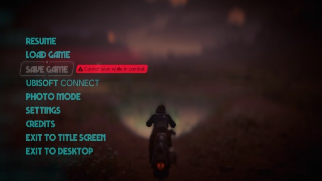 The easiest way to check is via the pause menu. The Save feature will be greyed out, and the message “Cannot save while in combat” will be displayed in red (pictured above).
