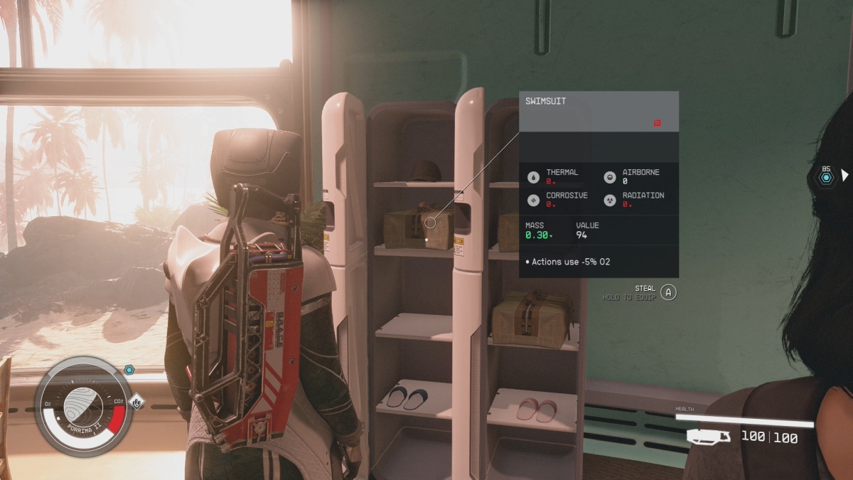 When you equip a swimsuit, you must remove any equipped Spacesuits, Packs, and Helmets to see the change. The swimsuit causes actions to consume 5% less O2. You can keep the suit for yourself, or Trade it to a companion to wear. Check multiple lockers to find more than one swimsuit, if desired. If you aren’t sneaky enough when stealing clothing, a resort guard may come to take it back.