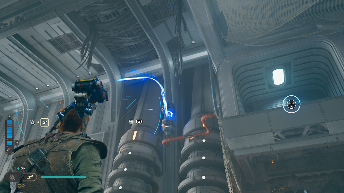 Follow the hallway right, till you reach a doorway. Jump out of it, and latch on the railing across. Then Force Dash into the green force field.