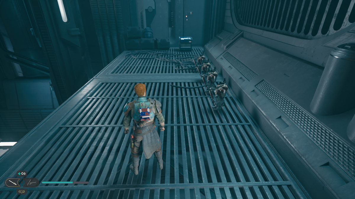 When you reach the other side, there will be a platform with stationary droids on it and a crate at the end. This is where the jacket’s colors will be.