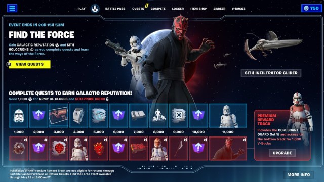 Next, let’s look at how to unlock the Darth Maul skin, which requires participating in the event. The Find The Force event acts as a mini Battle Pass, granting rewards at certain amounts of Galactic Reputation. There’s a free version and a paid, premium version of this event pass, which costs 1000 V-Bucks. Moreover, only the premium event pass contains Darth Maul. To unlock him, you need a total of 11,000 Galactic Reputation before the event ends.