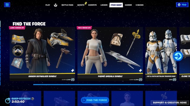 As mentioned above, the Anakin Skywalker and Padme Amidala skins are not from the event; they’re simply in the Item Shop. You can buy them in bundles, or buy individual items you like.
