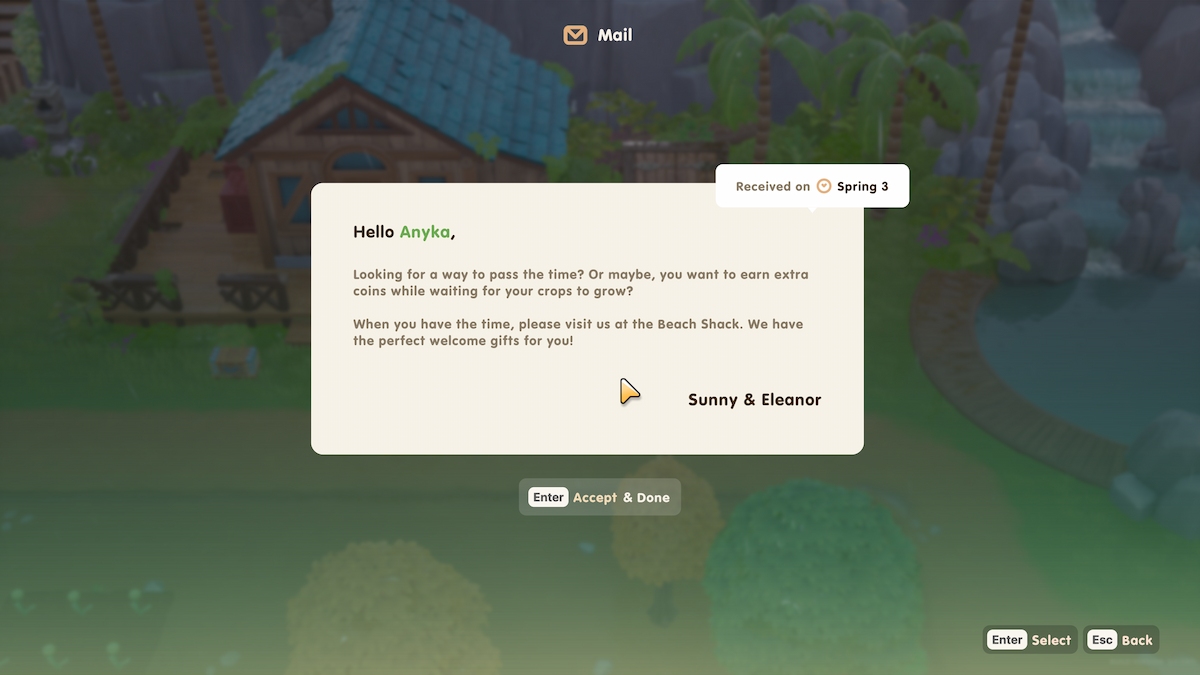Otherwise, once you receive the letter in the mail, head down to Sunny’s Beach Shack on the beach when it’s open. You’ll then get into a dialogue-filled cutscene where Sunny and Eleanor will offer you a Fishing Pole and a Bug Net. Yes, you can also catch bugs in Coral Island. If your inventory’s full, they’ll send it to your mailbox. But otherwise, you should now have a Fishing Pole!
