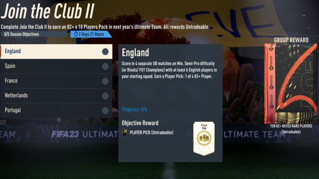 The trick for finding the objectives that will give you rewards in next year’s game are the ones that state so in the description. For example, the objective “Join The Club” states that you will gain a free pack of three Rare Gold Players from each EFIGS league in EA Sports FC 24. Some of these rewards are better than others, such as the “Join The Club II” objective, which grants a 82+ x 10 player pack in EA Sports FC 24 for completion.