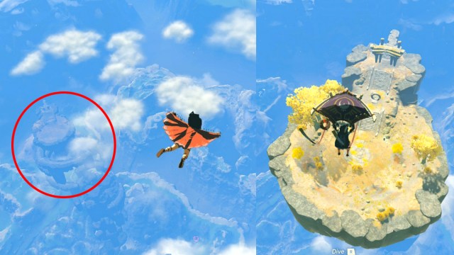 Upon landing on this island, you should see a Zonai mark to interact with, you should interact with this. This will then display a green circle, this is the beginning of a skydiving challenge, and you’re going to want to jump into it to complete this.