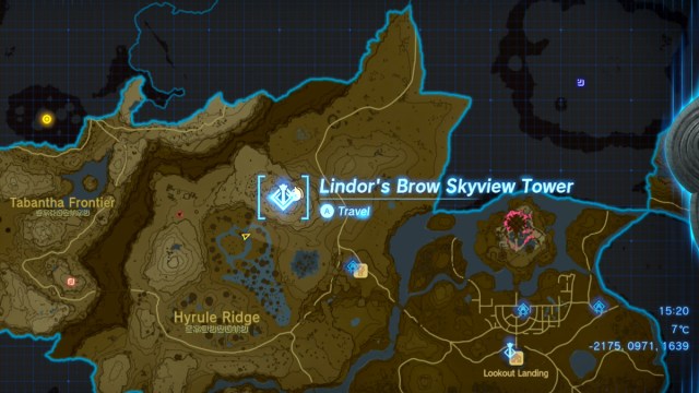 The first step to finding yourself the Glide Shirt is to head to the Lindor’s Brow Skyview Tower. You can find this to the direct west of Hyrule Castle, but if you need a more detailed location, you can either use these coordinates; -1898, 1241, 0296, or check out the map below.