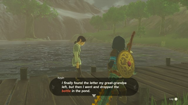 Walk towards Lake Sumac, and you should see a Hylian woman named Koyin. She tells you that she dropped a bottle with a letter inside in the lake. This will start the ‘A Letter to Koyin’ Side Adventure.