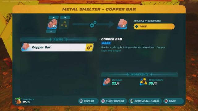 A Metal Smelter can be used in LEGO Fortnite to produce Copper Bars from Copper. Copper can be mined from the Lava Caves in the Dry Valley of Mesas. Copper ores can be found on the ground and walls of the cave and can be mined by using a Pickaxe. Afterward, put these Coppers inside the Metal Smelter to produce Copper Bars, which can be used to craft an Oven and Wooden Crate.