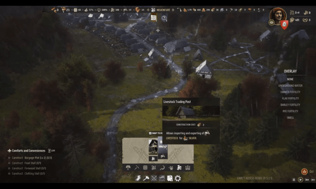 To acquire sheep in Manor Lords, you will first need to import them. To do this, first build yourself a Livestock Trading Post for two wood. Then, you must also build a Sheep Farm, which will cost only one piece of wood. Each farm must have a family running it, and it can only store five sheep or lambs.