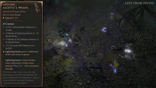 But what’s so special about the Unsung Ascetic’s Wraps? For Druids, you gain a Unique Effect specifically aiding the Lightning Storm skill. Here are the stats to this item: