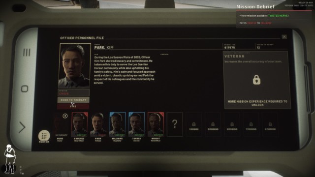 Between missions, hold “Tab” to bring up your Roster menu, where you can click an officer and select “Send to Therapy” in Ready or Not. Early in the game, you’ll have fewer officers to work with so you have to choose carefully. Officers can have the following statuses in the game:
