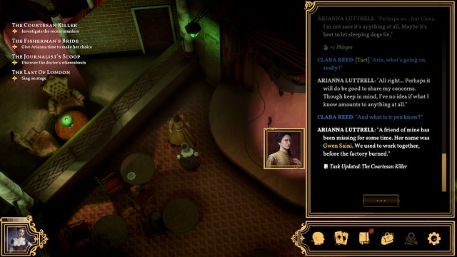 Another spot you can find out about a victim is right before Clara is about to sing on stage during Chapter Seven. Speak to Arianna Luttrell in the Velvet Rose, standing right beside the stage. Press her for information, and she’ll mention that her friend Gwen Saini went missing for some time.