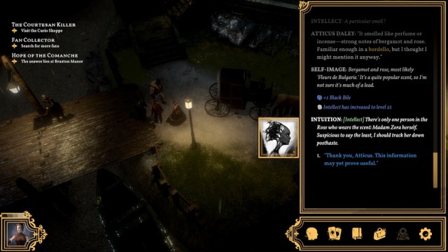 Otherwise, the most potent information about the Courtesan Killer is when you eventually meet up with Atticus at Braxton Manor. If you make a successful check to try and discern the smell Atticus is describing from the crime scene, you’ll connect the smell to Madam Zora.