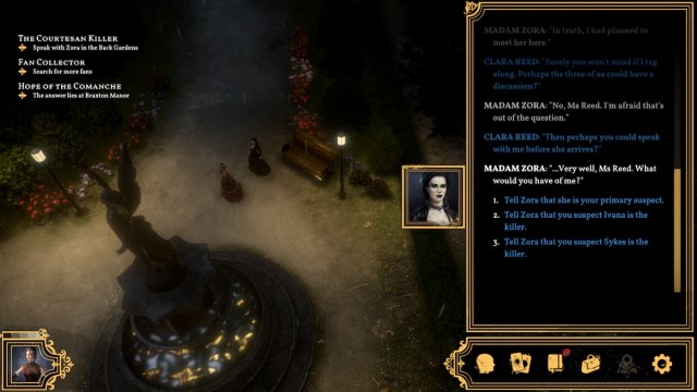 Head inside the manor and ask Lady Braxton about Zora’s whereabouts. She tells you that Zora is out in the back gardens. Walk through the door just north of you to the back gardens and confront Zora. I had the guts to say that she was my primary suspect. Lo and behold, after I followed her, I figured out that she truly was the killer.