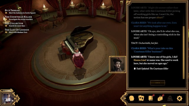 One of the first places I started to pick up information about the victims was in the Velvet Rose, which is inside the Palladium at Beggar’s Lane. You should find Louise Artz sitting at the grand piano. Talk to her about the murders, and you should get information about one of the victims, Hanna Lind.