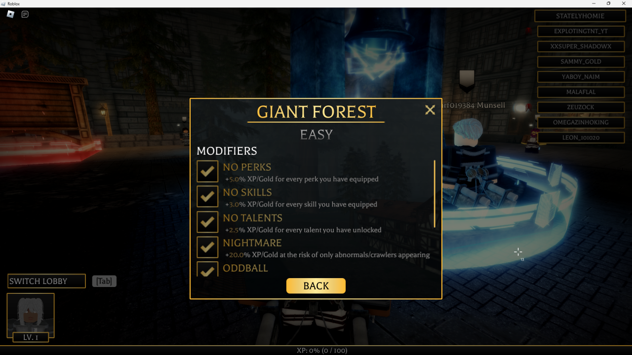 It doesn’t stop there. Once you click Create, there is the option to add modifiers. These modifiers will make the game harder in a variety of ways, such as adding fog to the match or increasing Titan’s health. However, they will also provide a lot more XP in Attack on Titan Revolution, resulting in a much faster level-up. I recommend turning them all on.