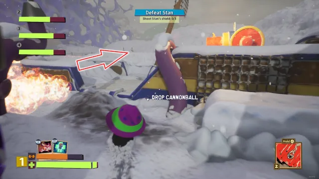 Stan is the boss of Chapter 3, and considering you had to beat the Snow Plow to get here, it really stings to lose. The battle is in three parts, and the first is breaking Stans’s defenses.