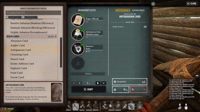 Once the Enchanter’s Focus is built in Nightingale, you can use Paper, Ink, and Essence Dust to make Realm Cards, both Major, Minor, and Biome. Only the Abeyance Card and Biome Cards don’t require Essence Dust.