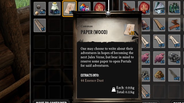 If you’re lacking in Essence Dust, simply go outside, pick up Plant Fibre, Sticks, and Stones, and Extract them from your inventory. You only need a little, so this will be fine.