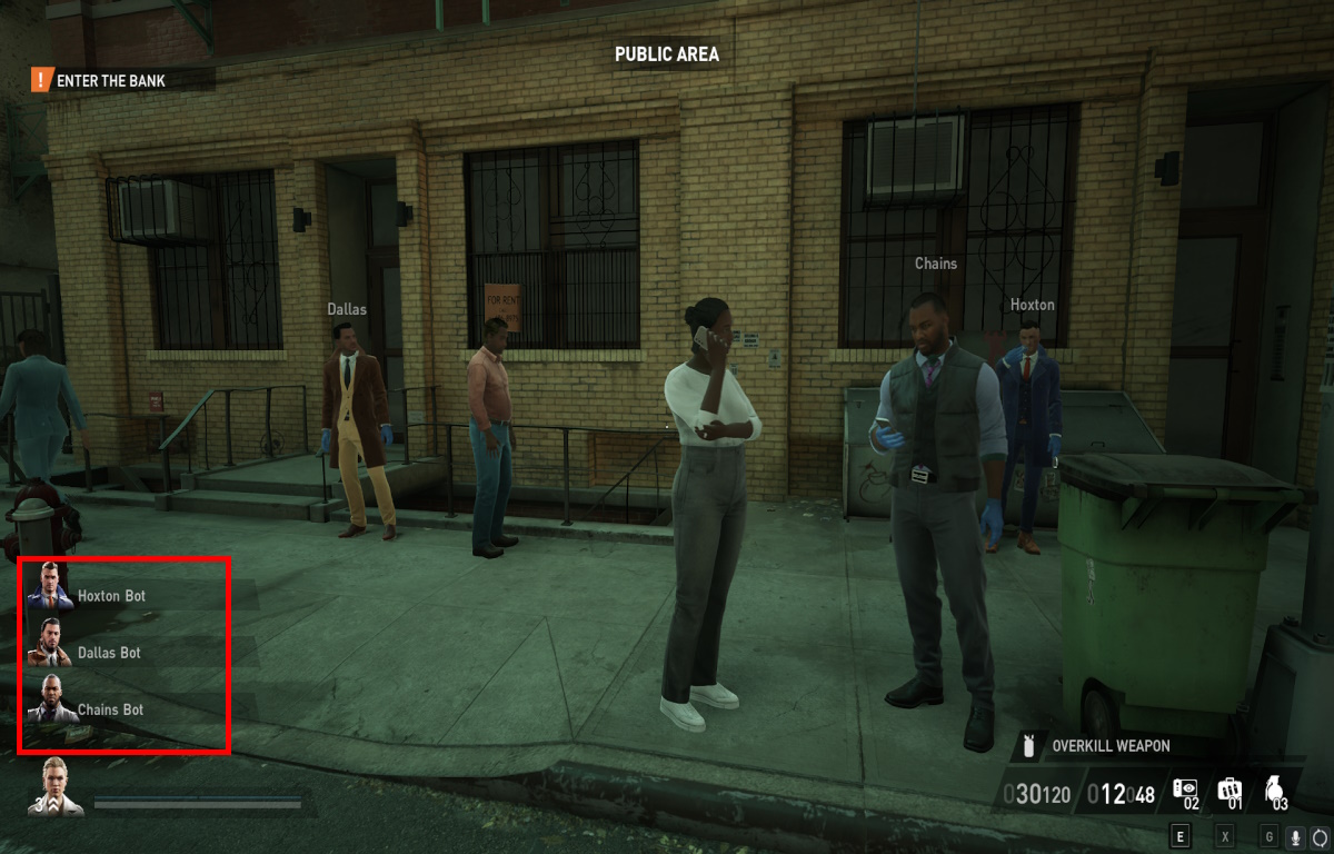 When you join the heist, your teammates are replaced with random bots. You can tell this has happened, as their names will be similar to my squad in the picture above. As you may expect, bots are pretty stupid, but their behavior is predictable. At the start of a heist, they will slowly amble towards you, but they won’t do anything to raise suspicion or compromise the mission. Sadly, you can’t tell them to wait at the start while you do everything else, but it’s better than nothing.