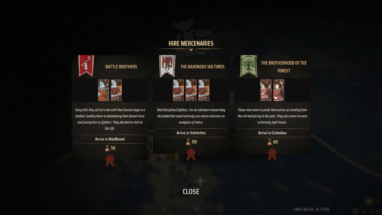 Using mercenaries to keep shutting down the Bandit camps as soon as they arise is very important. You will be swimming in Influence and you’ll be earning much more money than it will cost to hire one. I would recommend doing a grand tour with one mercenary army to maximise cost effectiveness.
