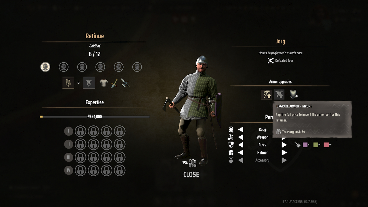 Build the Manor to gain your first retinue, a separate unit to your militias. With the six militia units and your retinue, you’ll have seven units for battle. You will find your retinue in the army tab. Over time, purchase more retinue soldiers and upgrade their gear, through importing or crafting.