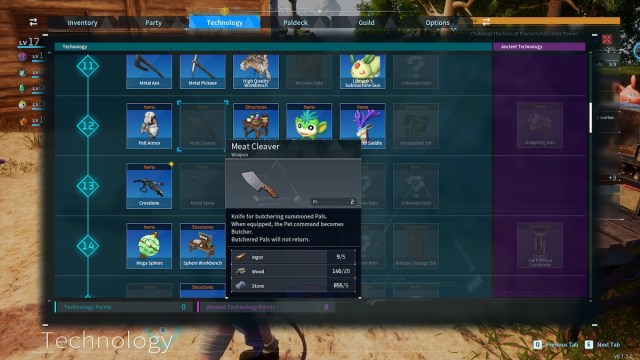 The only other known way of getting rid of unwanted Pals is to unfortunately use a Meat Cleaver on them. On Technology level 12, you can unlock the Meat Cleaver for two points. Once you craft one, you can summon a Pal, press the “4” key, and select “Butcher.”