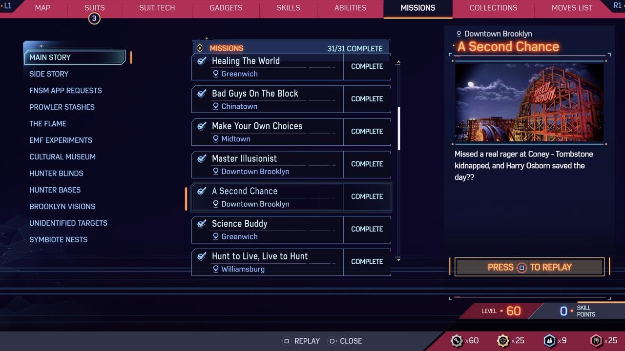 For starters, you can only replay missions in Spiderman 2 if you’ve completed the mission. That should go without saying. You can’t replay something you haven’t played yet. The good news is that you can replay both campaign and side missions.