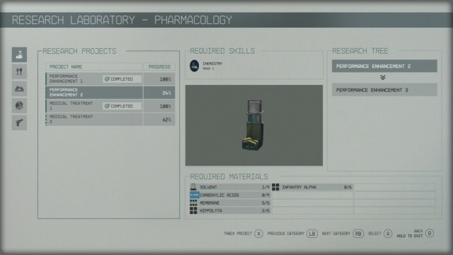 There are five categories for research: Pharmacology, Food and Drink, Outpost Development, Equipment, and Weaponry. Suppose you are interested in researching in the Pharmacology category, which allows you to produce your own medical supplies. Initially, you will have a few research projects available. The simplest ones require common components. For instance, you can fully research the Performance Enhancement 1 project by supplying Argon x2, Tetraflourides x2, and Metabolic Agent x3.