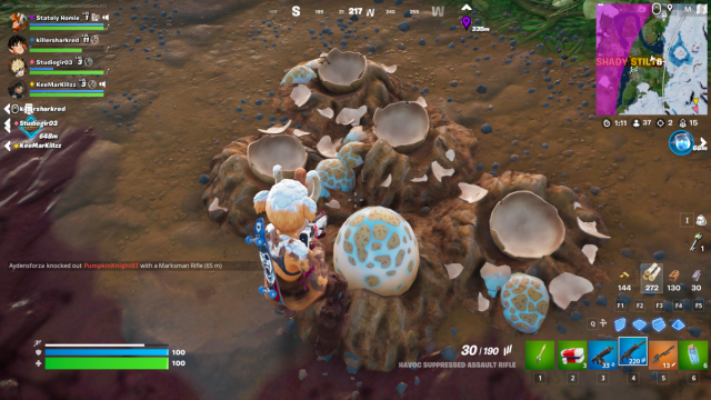 However, sometimes you may find that you’re struggling to spot a Raptot in the wilds of Fortnite. So, make your way to the Jungle biome and look for their eggs scattered around on the floor. They are blue and white and are placed inside nests. Simply hold down E to hatch it and jump on board.
