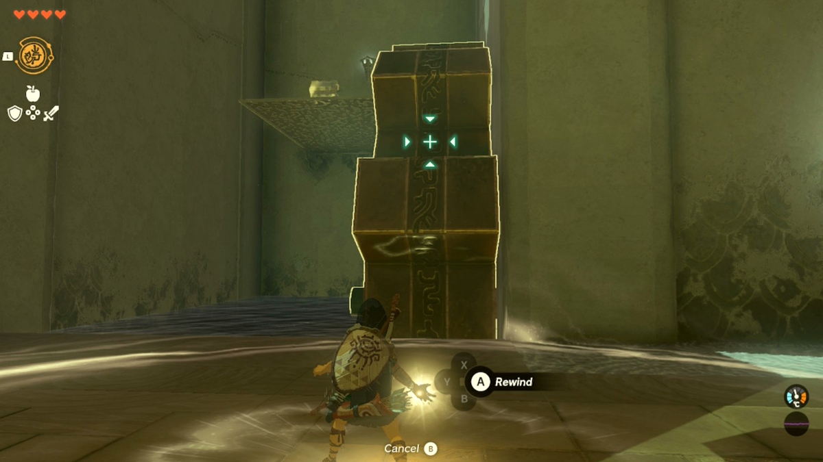 Upon entering this shrine in Tears of the Kingdom, the first thing you’re going to notice is a body of water that’s flowing towards you with a raft on it. Don’t do what I did on my first attempt at this shrine and just jump into the water, as you’ll be forced backwards and die. Instead, to solve the first Nachoyah Shrine puzzle in Tears of the Kingdom, wait for the raft to approach you, and then use the Recall ability to send it back to where it comes from.