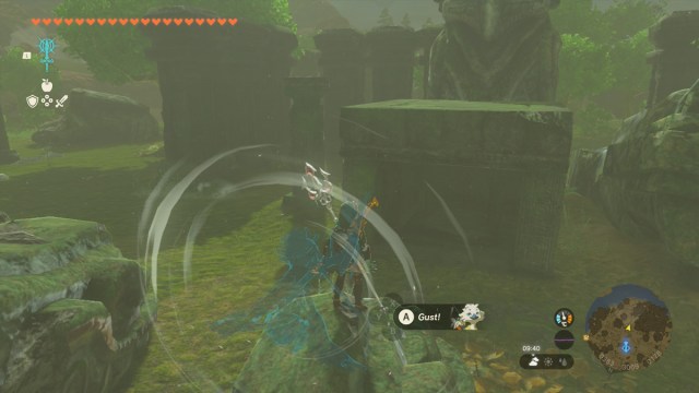 The solution to the first puzzle lies right behind the stone tablets and just over the wall. You’ll see a large owl statue with several dragon heads laying on the ground in front of it. All you need to do is use the Sage of Wind’s Gust ability in front of the owl statue. Then loot the chest that appears.