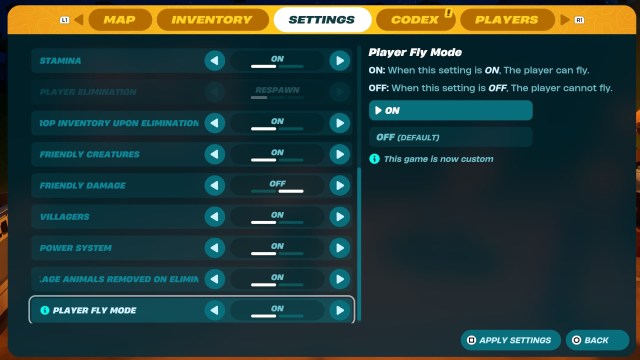 If you’re playing in the regular mode, you can still enable flying to find your Bus Stops. Bring up the map and scroll over to the Settings Tab. You can turn on Player Fly Mode at the bottom of the list (pictured above).
