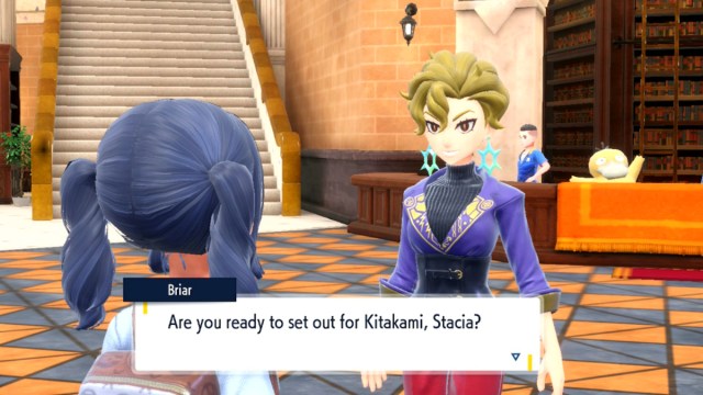 After you have the phone call with Jacq, you’re going to want to make your way to the school in Mesagoza. The name of the school is different depending on the version you’re currently playing, but the school is always in the same place. Once you make your way to the school, you’ll need to go inside and speak with Briar, who is right in front of the door as you enter wearing a purple jacket and some lovely Tera earrings. After the initial conversation, Briar will ask you to speak to them when you’re ready to head out for Kitakami, and if you’re ready right then and there, speak to her immediately and you can head out for Kitakami and start the Teal Mask DLC.