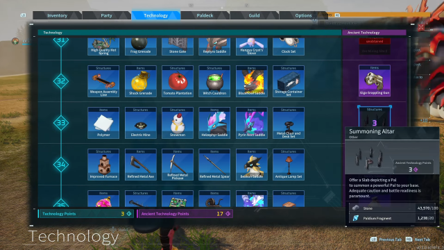 The first thing you need to summon a Palworld raid boss is the Summoning Altar. This can be unlocked through your Technology Tree at level 32 and requires three Ancient Technology Points. Once you have unlocked it, it will be time to build the structure, and it is big.
