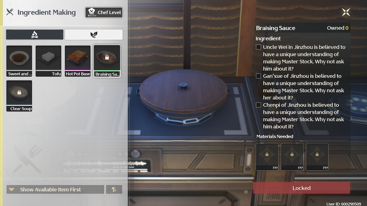 Braising Sauce will be locked to you when starting Wuthering Waves, preventing you from making anything that uses it. To find out the three ingredients that makeup Braising Sauce, you’ll need to ask around.