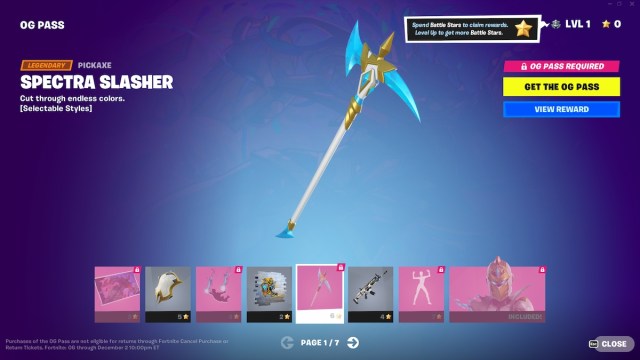 Don’t just want the Spectra Knight skin? Well, you can unlock accessories in the OG Pass like Spectra Protector Back Bling and Spectra Slasher Pickaxe. Luckily, the color options you get from purchasing the OG Pass can be used to customize these accessories. Here are the Spectra Knight-themed OG Pass items: