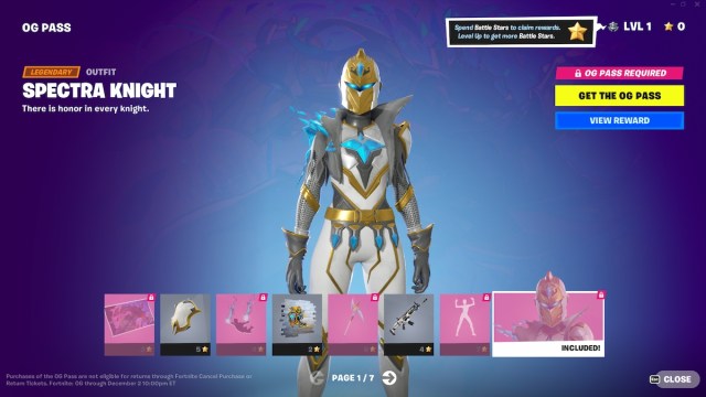 As soon as you purchase the Battle Pass, you’ll unlock the Spectra Knight skin and its color variants. It’s right on page one of the OG Pass, so you don’t have to wait long at all to get your hands on it. If you’ve played Fortnite for a long time, you’ll probably realize its color options pay honor to the Red, Black, and Ultima Knight.