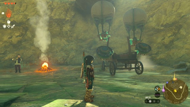 When you encounter Eustus on the journey to unlock this Great Fairy Fountain in Tears of the Kingdom, you need to talk to him before you can do anything else to proceed, so talk to him and activate The Hornist’s Dramatic Escape Side Adventure. In this Side Adventure you need to get Eustus out of his hole by using the materials around you to build a flying cart. You can refer to the image below on how I did that, which worked out for me. The only thing to note here is to have the fans pointing diagonally upwards to give upwards and forwards momentum at once. You also need to leave room for Eustus to get on the cart, so build everything around the outside and not anywhere near the interior seating.