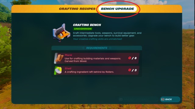 Now that you have all the resources needed for the upgrade, head to the Crafting Bench. Interact with the bench, on top where it says Crafting Recipes, and navigate to the left of it to the Bench Upgrade. From here, you’ll enhance your bench with more recipes. When you go back to the Crafting Recipes option, you should see more tools ready to be made if you have the resources. To create the Rare Axe, simply press on the blue Forest Axe.