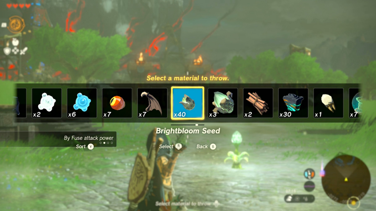 Using your Brightbloom Seeds is something you can do in a couple of ways in Tears of the Kingdom. The first method you can use is to simply throw them on the ground, via the material throwing mechanic. This might be new to you, as it was to me a few hours in, that if you hold the weapon throwing button and press up on the D-Pad, you can actually throw materials. This means you don’t need to use other items to get them around the place and just throw what you need, in our case Brightbloom Seeds, and they still have their fused effect.