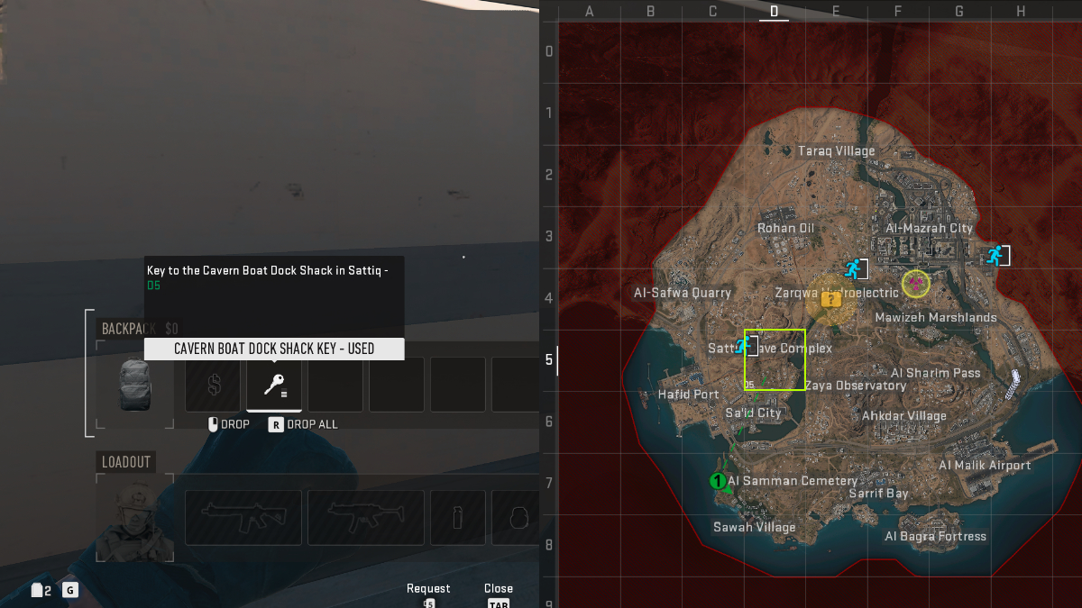 Once you have a key you’ll need to head to the appropriate location to use it. Hovering over your key in your inventory will give you a rough indication of where to travel. For example, the Cavern Boat Dock Shack Key states that it can be used in grid D5. Look at your map and find where grid D5 is and head over there. Unfortunately, it doesn’t provide an exact location, so you will have to search around the area.