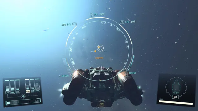 To use thrusters on your ship, hold the right bumper on your controller or press the Space key when using your mouse and keyboard. Combine thrusters with directional and movement controls for tighter turns, or to quickly change course before boosting.