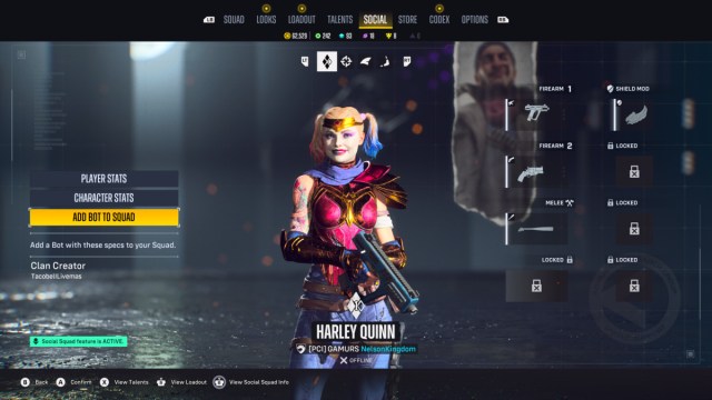 Once you’ve found the player you want to add to your Social Squad, inspect them and view their full profile. This will bring you to a page with all four of their Suicide Squad characters available to view along with their full list of stats. There’ll also be an option to “Add Bot to Squad,” which is what you need to select to add them to your team.