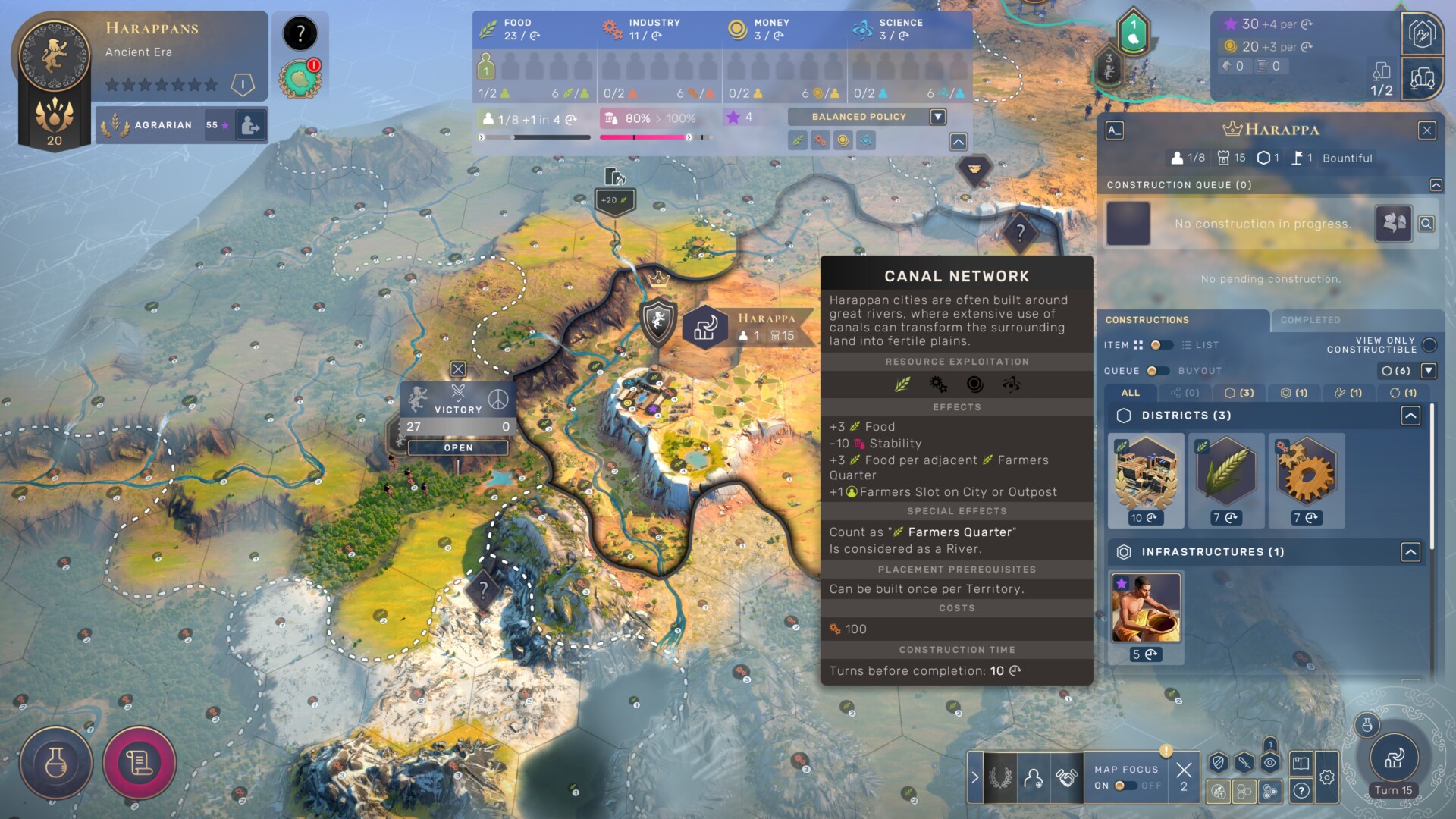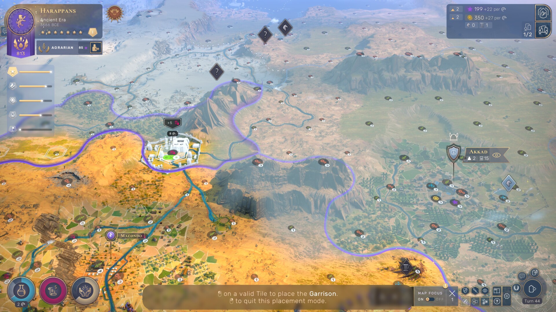 Sufficed to say, these early-game options might have you wondering about your city’s stability. In general, most districts that you construct and the additional outposts you attach will cause drops in stability. Newly conquered cities will also be mutinous. You may use extractors on luxury resource nodes or build Garrisons (Ancient Era: City Defense tech). Luxury resources and garrisons provide a stability boost, and the latter also acts as a fortification. Another decent use for Garrisons is that they can be spawn points for units (just select a Garrison and click on the sword icon).