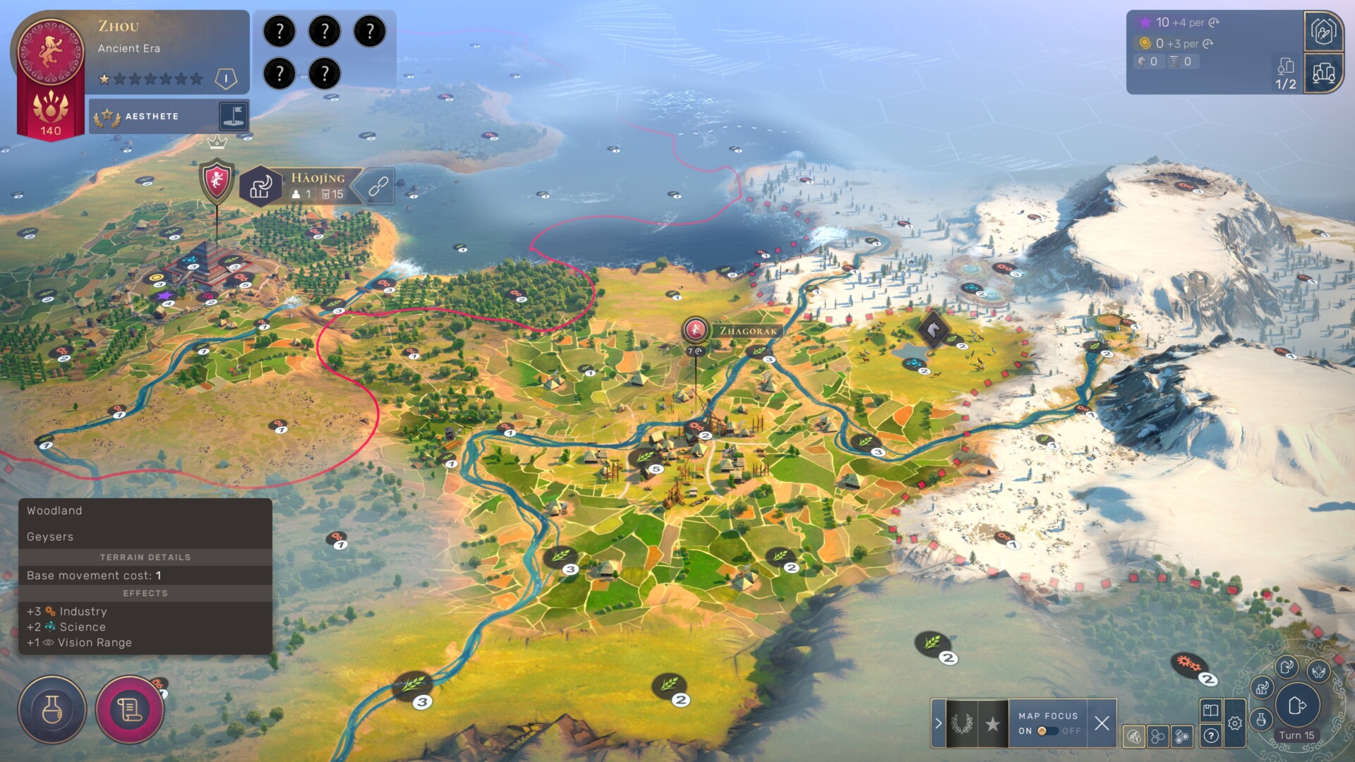 Likewise, we also need to talk about adjacency bonuses. As mentioned in our beginner’s guide, terrain plays a major role here since features provide extra yields. Ideally, you’ll want Farmers Quarters near rivers and prairies (+food), and Makers Quarters should be on stone fields and forests (+industry). Research Quarters should be next to strategic resources (+science) and Makers Quarters ought to be close to luxury resources (+money).