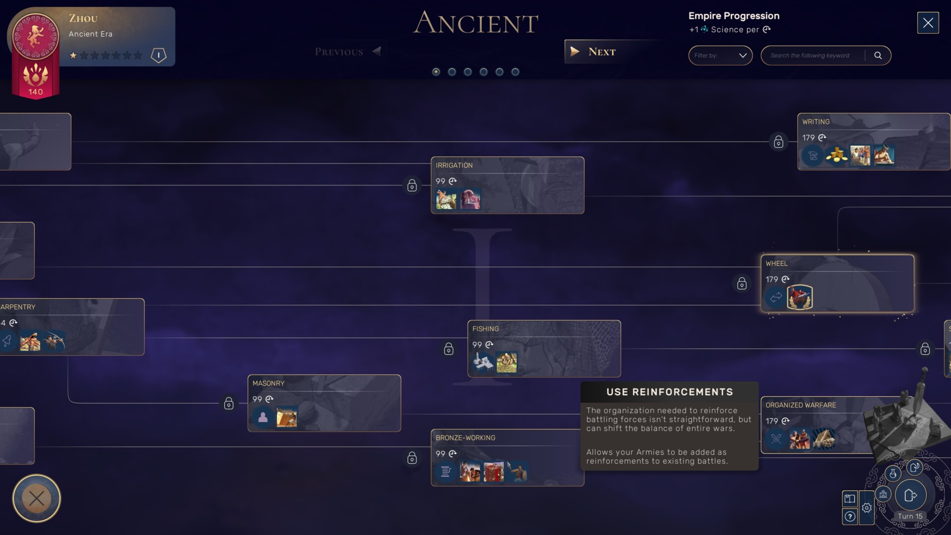 - Organized Warfare – Allows you to bring reinforcements during tactical battles. Without this, only one army can be controlled at a time. Once this is researched, other armies in the vicinity will act as reinforcements, greatly pushing the auto-resolve bar to your favor.