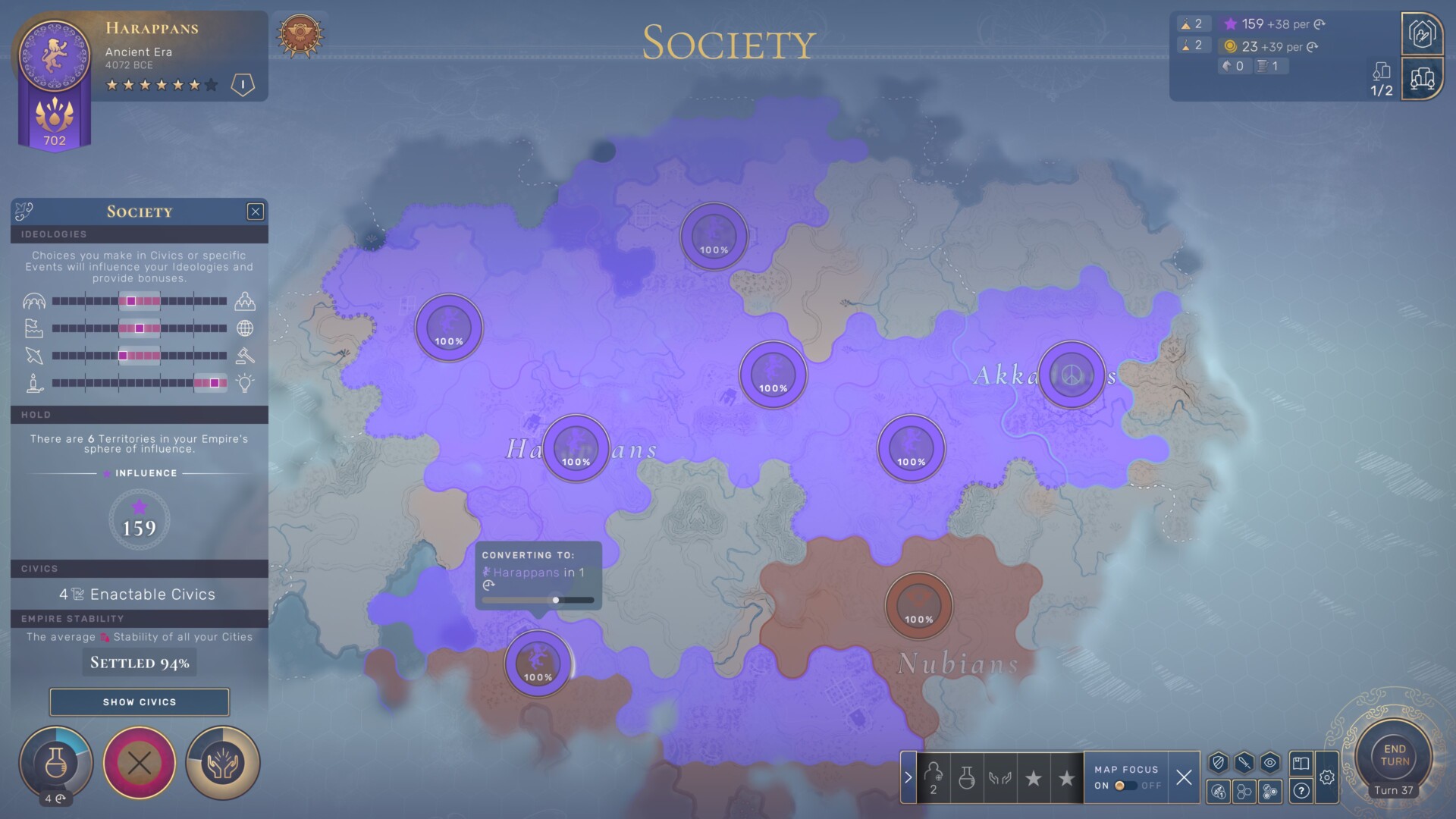 Civics are chosen ideologies that drive your empire forward in Humankind. You’ll unlock new ones based on your influence generation as well as all the territories under your sphere of influence. Religion also has a similar concept, except that it focuses on your faith generation and all the followers of your state religion among the world’s population.