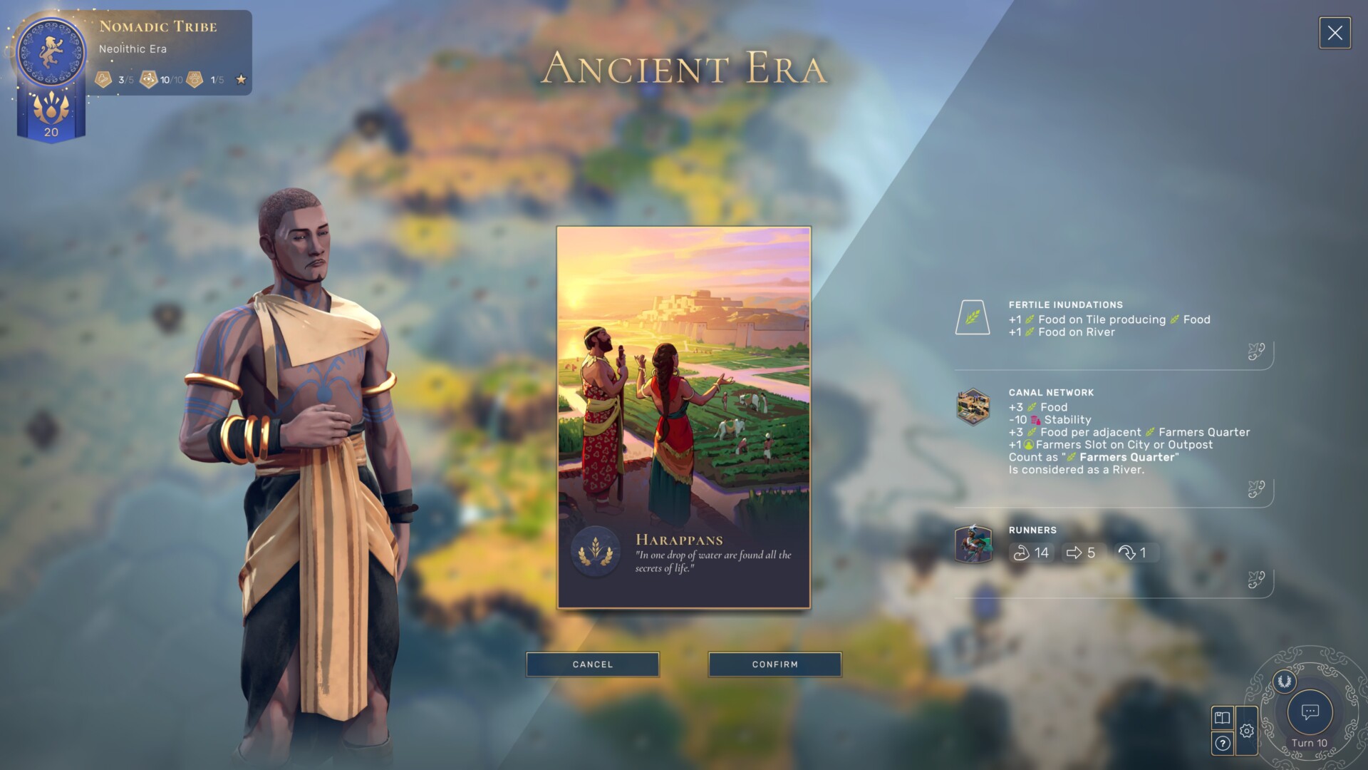 | Agrarian | Harappans | Fertile Inundations +1 food on districts that produce food; +1 food on river tiles | Canal Network -10 stability; +3 food; +3 food per adjacent Farmers Quarter; +1 farmer slot; tile is considered a river | Runners (melee) Pathfinder – Ignores movement penalties from forests. |