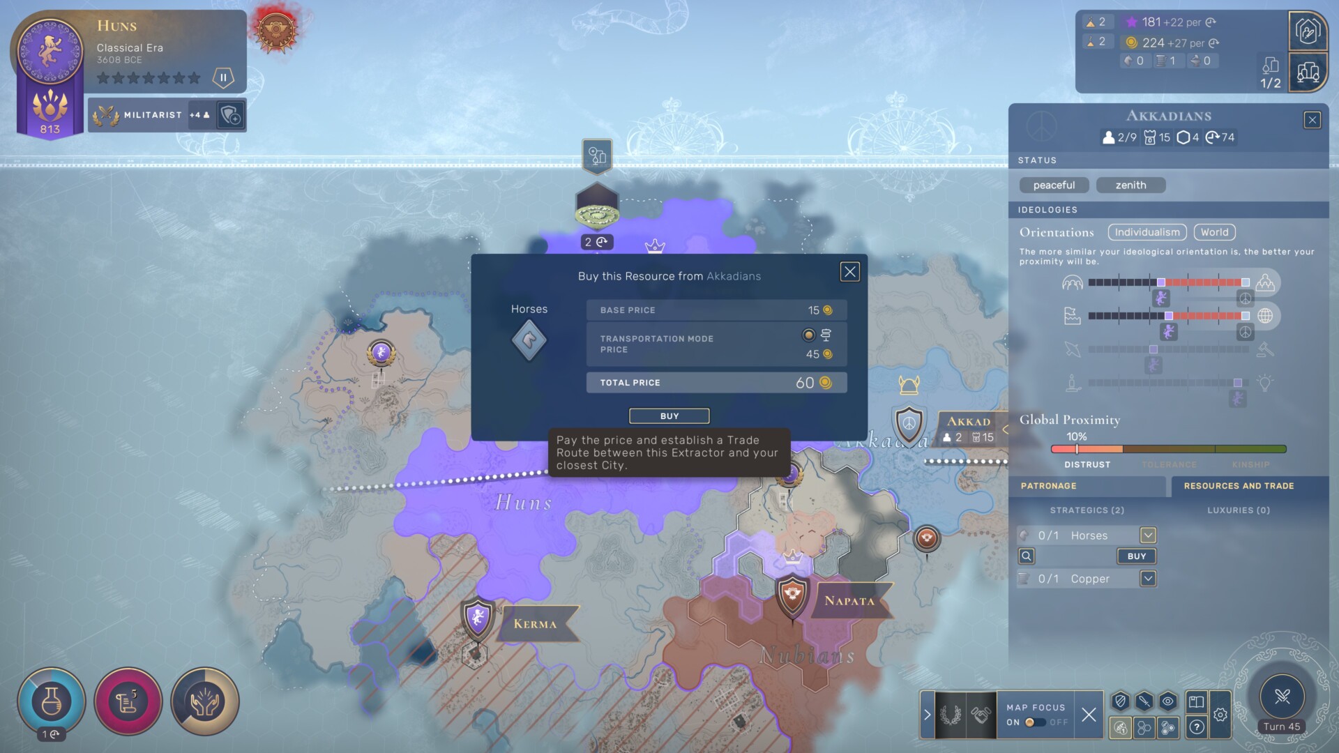 Note: Specifically concerning trade, you may buy/sell resources depending on the active deals. Similar to what you do with free peoples, a land or water trade route is created from the resource node to your capital.